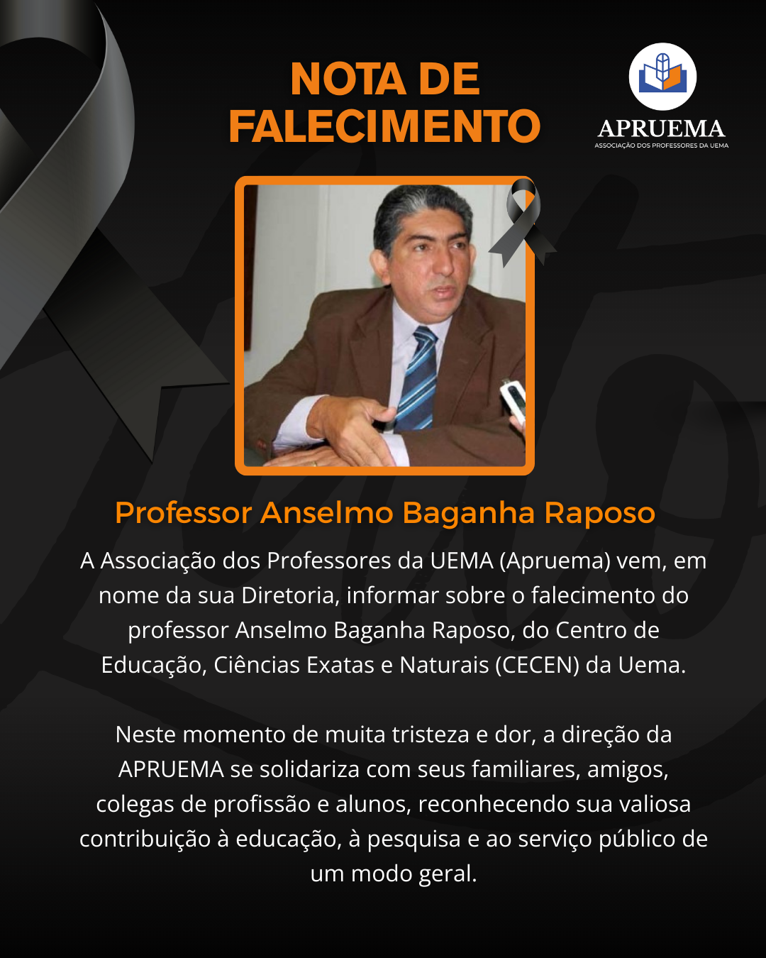 A Associação dos Professores da UEMA (APRUEMA) vem, em nome da sua Diretoria, informar sobre o falecimento do professor Anselmo Baganha Raposo, do Centro de Educação, Ciências Exatas e Naturais (CECEN) da UEMA, ocorrido hoje, dia 29 de setembro, aqui em São Luís.