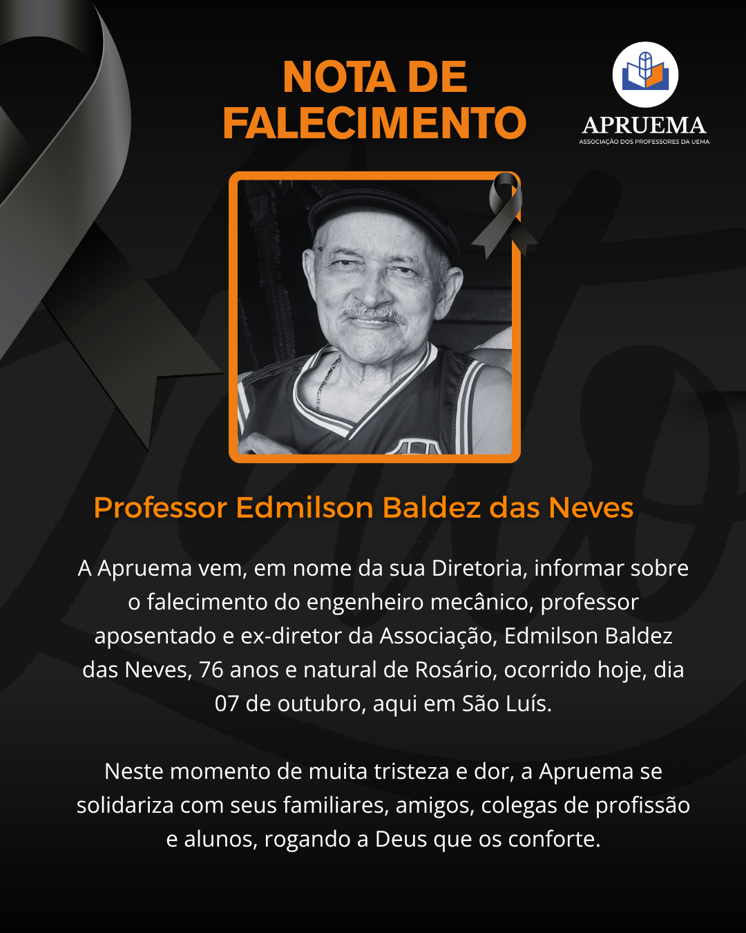 A Associação dos Professores da UEMA (APRUEMA) vem, em nome da sua Diretoria, informar sobre o falecimento do engenheiro mecânico, professor aposentado e ex-diretor da Associação, Edmilson Baldez das Neves, 76 anos e natural de Rosário, ocorrido hoje, dia 07 de outubro, aqui em São Luís.