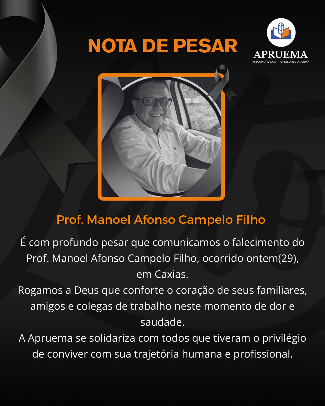 A Associação dos Professores da Universidade Estadual do Maranhão (Apruema) manifesta profundo pesar pelo falecimento do Professor Manoel Afonso Campelo Filho, ocorrido ontem, 29 de dezembro. Ele era docente do Departamento de História e Geografia da Universidade Estadual do Maranhão (Uema), no Campus Caxias.